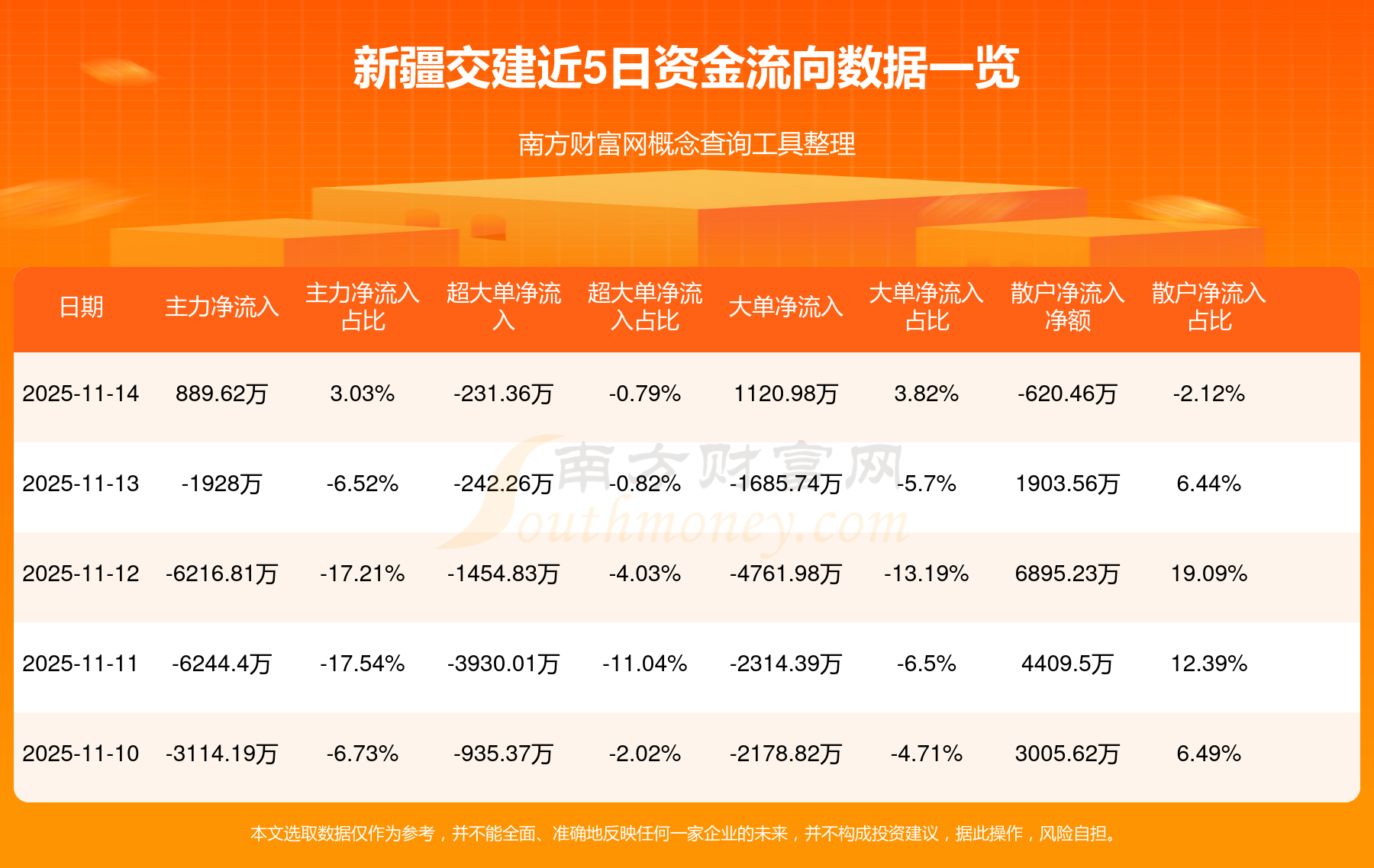 11月14日消息,新疆交建11月14日主力資金凈流入889.62萬元,超大單資金凈流出231.36萬元,大單資金凈流入1120.98萬元,散戶資金凈流出620.46萬元。