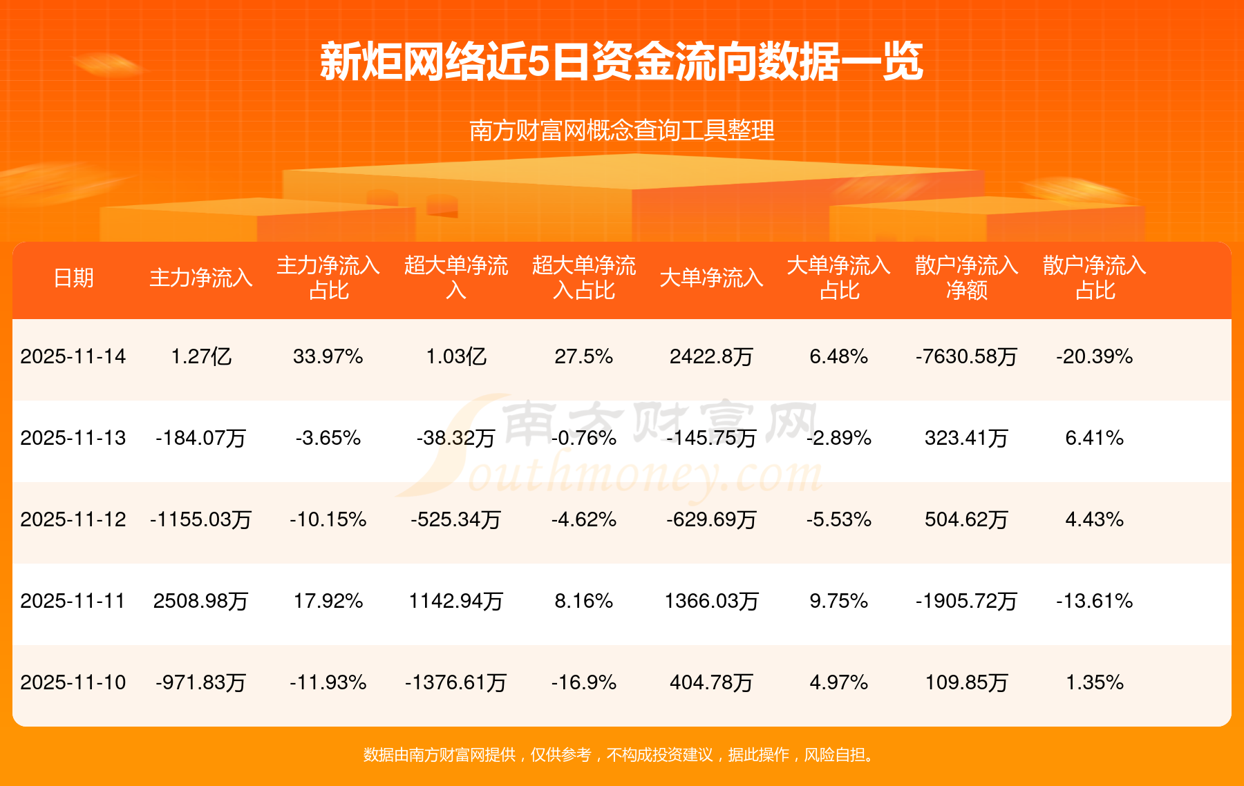 11月14日該股主力凈流入1.27億元,超大單凈流入1.03億元,大單凈流入2422.8萬元,中單凈流出5079.73萬元,散戶凈流出7630.58萬元。