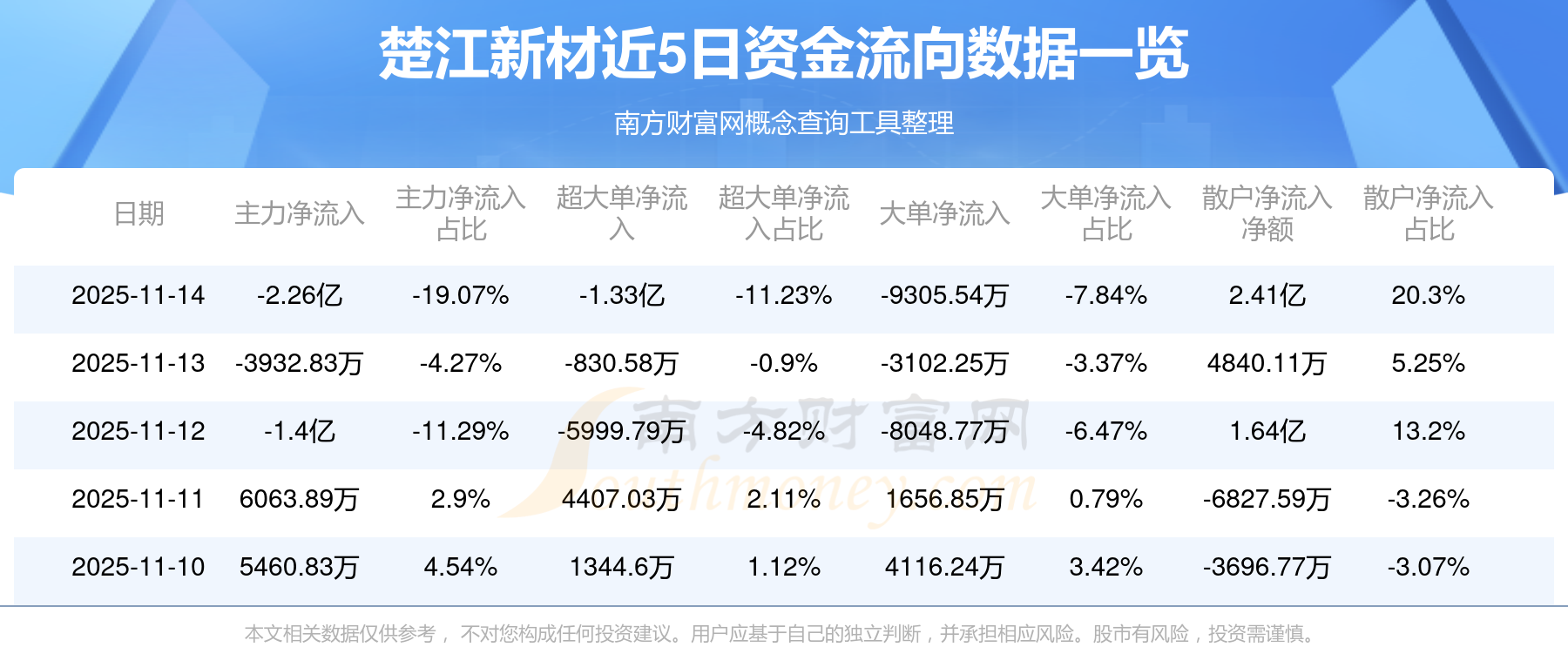 11月14日消息,楚江新材11月14日主力凈流出2.26億元,超大單凈流出1.33億元,大單凈流出9305.54萬(wàn)元,散戶凈流入2.41億元。