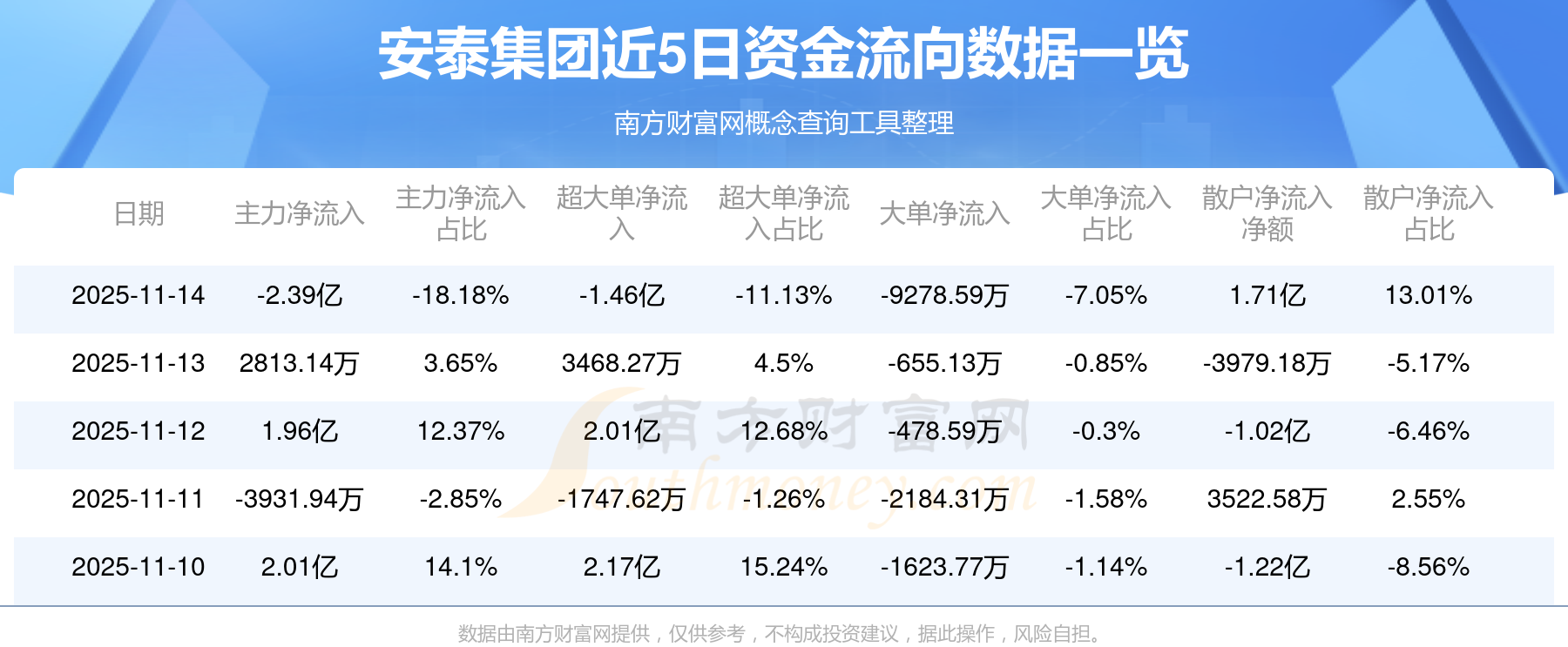 11月14日消息,安泰集團(tuán)主力凈流出2.39億元,超大單凈流出1.46億元,散戶凈流入1.71億元。