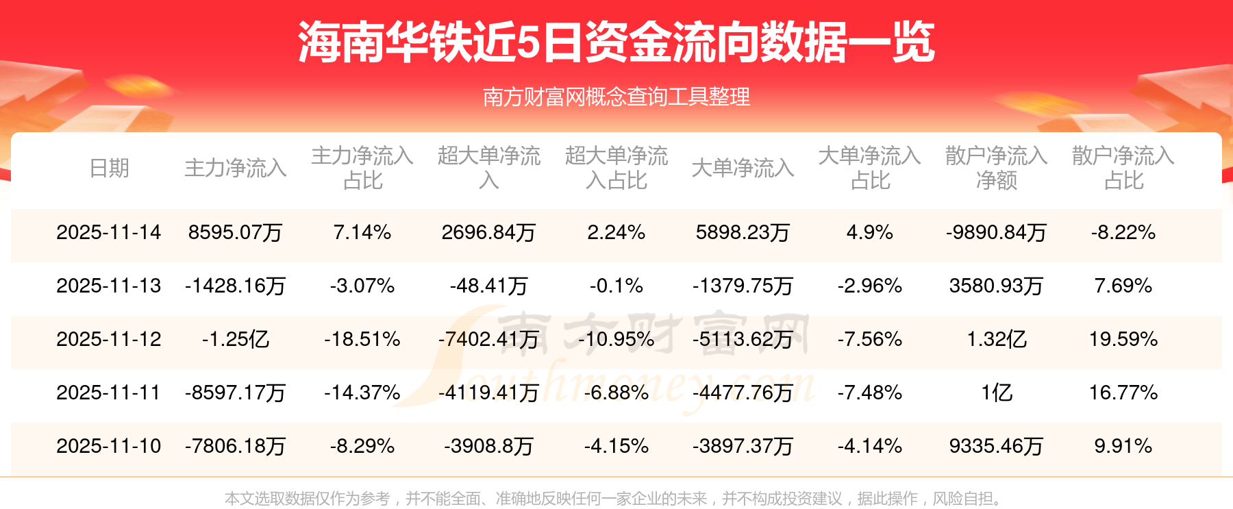 11月14日消息,海南華鐵11月14日主力資金凈流入8595.07萬元,超大單資金凈流入2696.84萬元,大單資金凈流入5898.23萬元,散戶資金凈流出9890.84萬元。