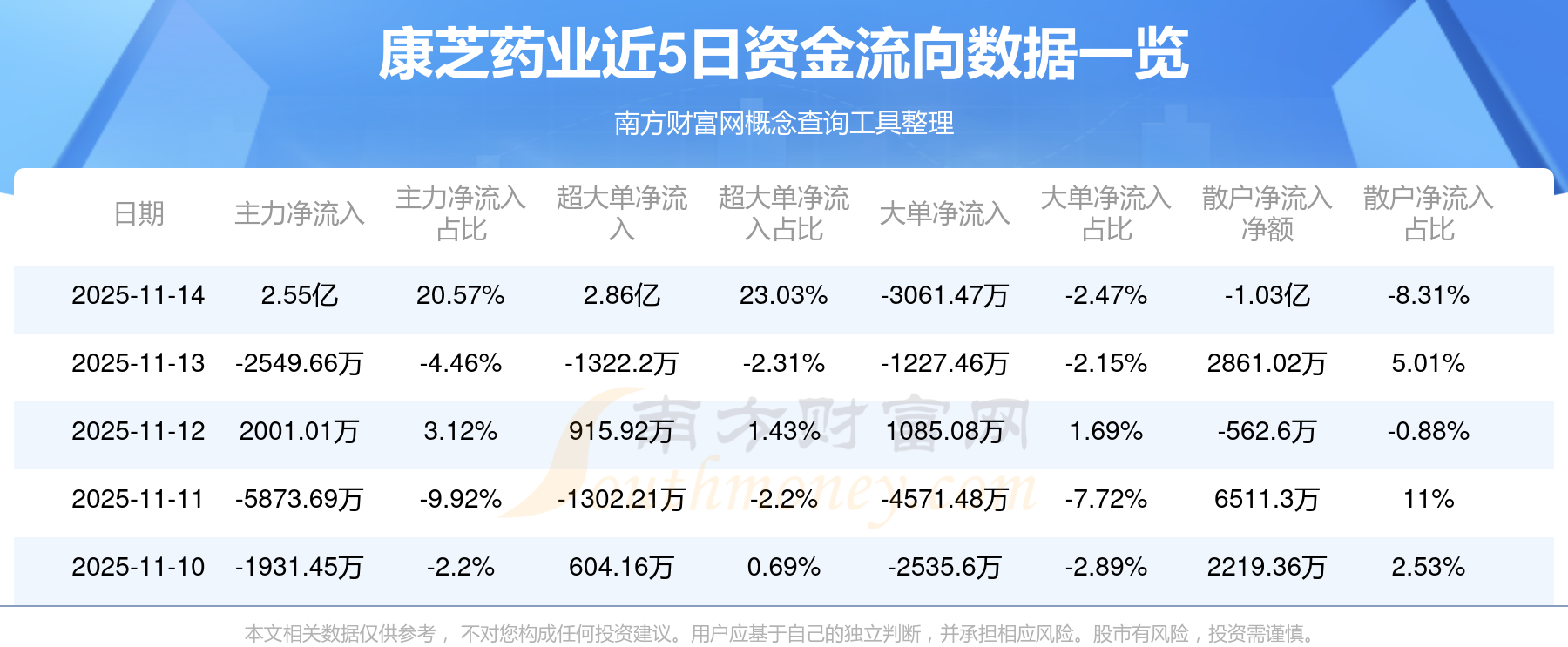 11月14日消息,康芝藥業(yè)資金凈流入2.55億元,超大單凈流入2.86億元,換手率28.34%,成交金額12.42億元。