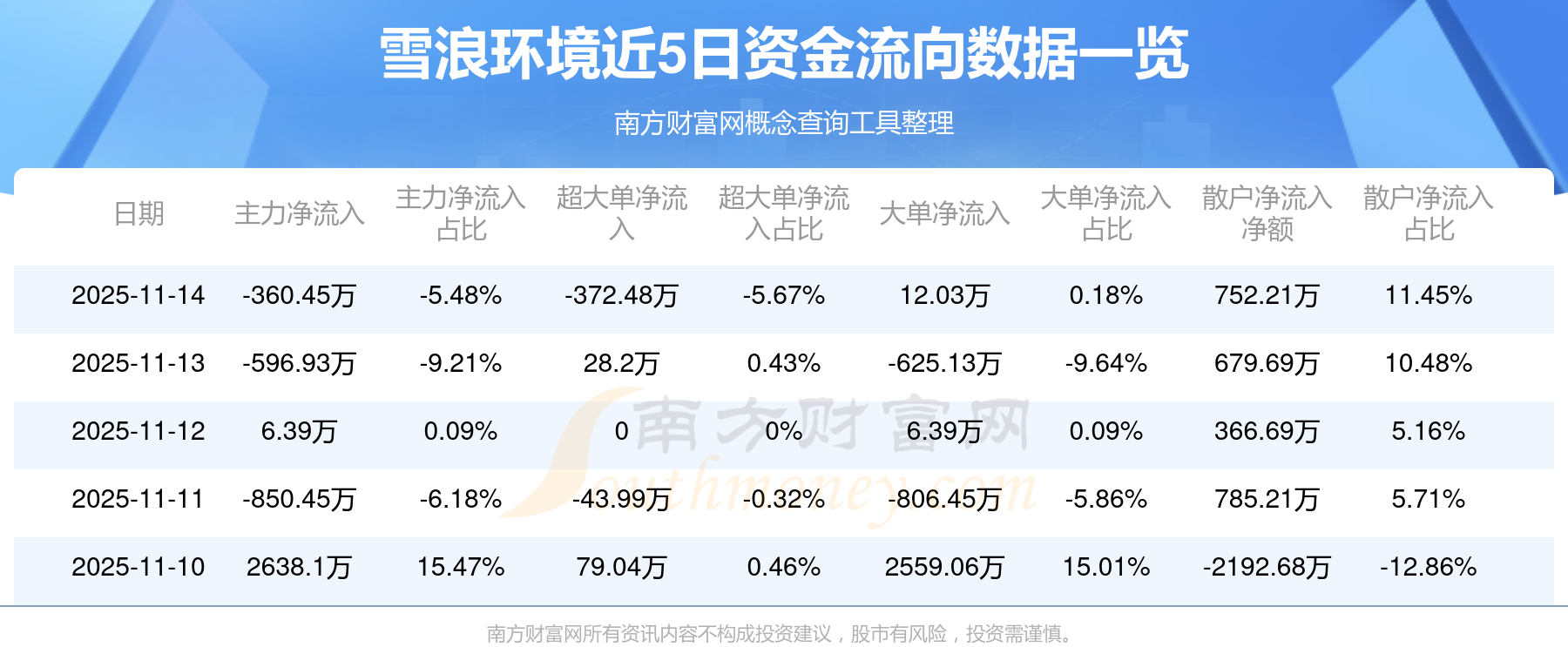 11月14日消息,雪浪環(huán)境主力凈流出360.45萬元,超大單凈流出372.48萬元,散戶凈流入752.21萬元。