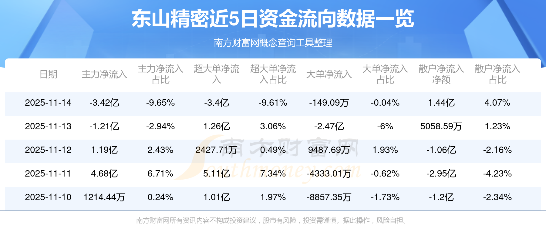 11月14日,東山精密開盤報70元,截至15時,報69.110元,成交額35.41億元,換手率3.66%,市值為1265.82億元。
