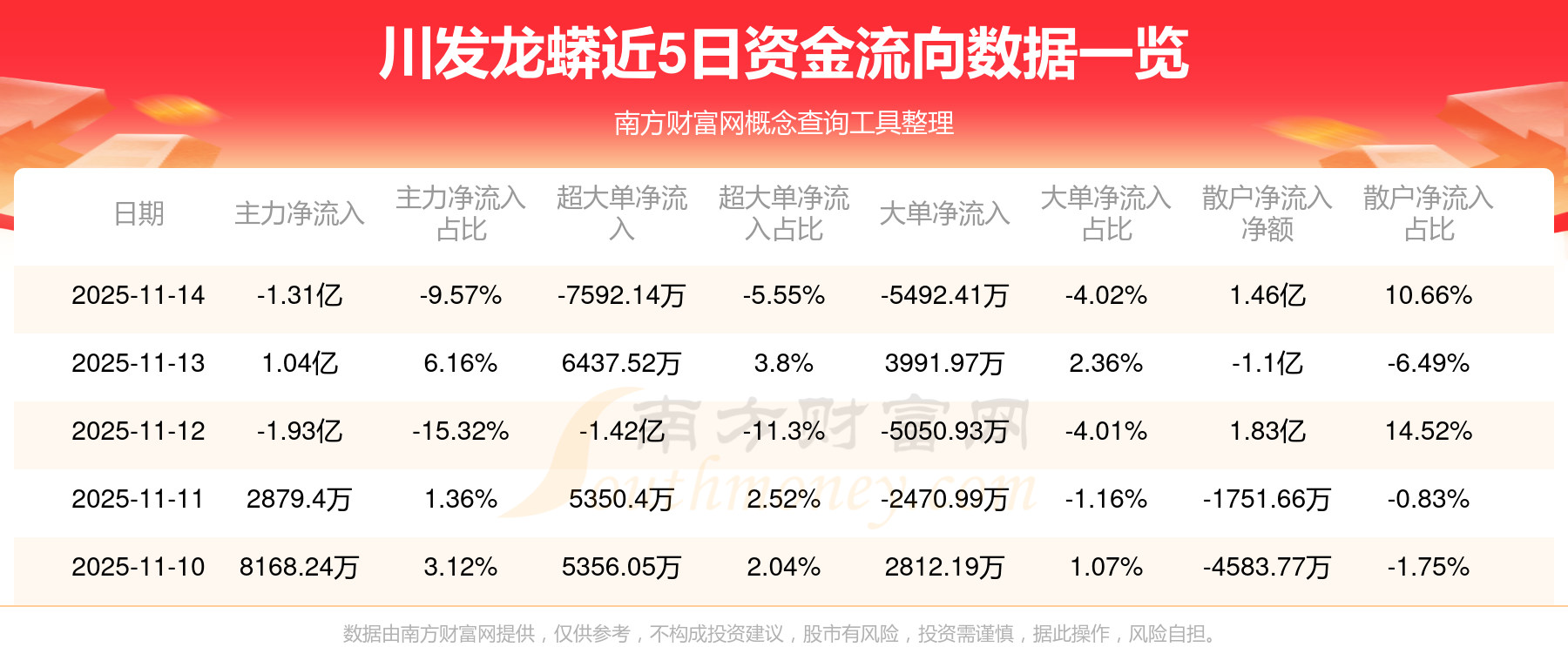 11月14日消息,川發(fā)龍蟒主力資金凈流出1.31億元,超大單資金凈流出7592.14萬元,散戶資金凈流入1.46億元。