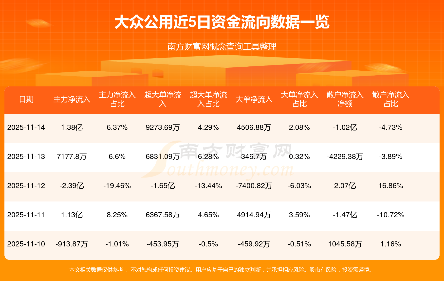 11月14日消息,大眾公用11月14日主力資金凈流入1.38億元,超大單資金凈流入9273.69萬(wàn)元,大單資金凈流入4506.88萬(wàn)元,散戶資金凈流出1.02億元。