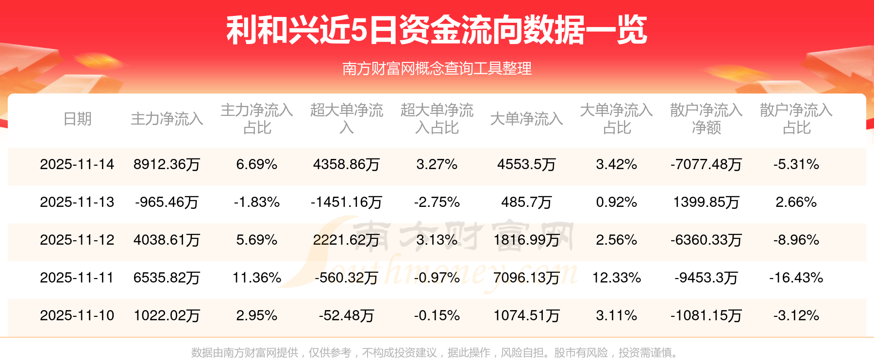 11月14日消息,利和興資金凈流入8912.36萬元,超大單凈流入4358.86萬元,換手率24.16%,成交金額13.33億元。