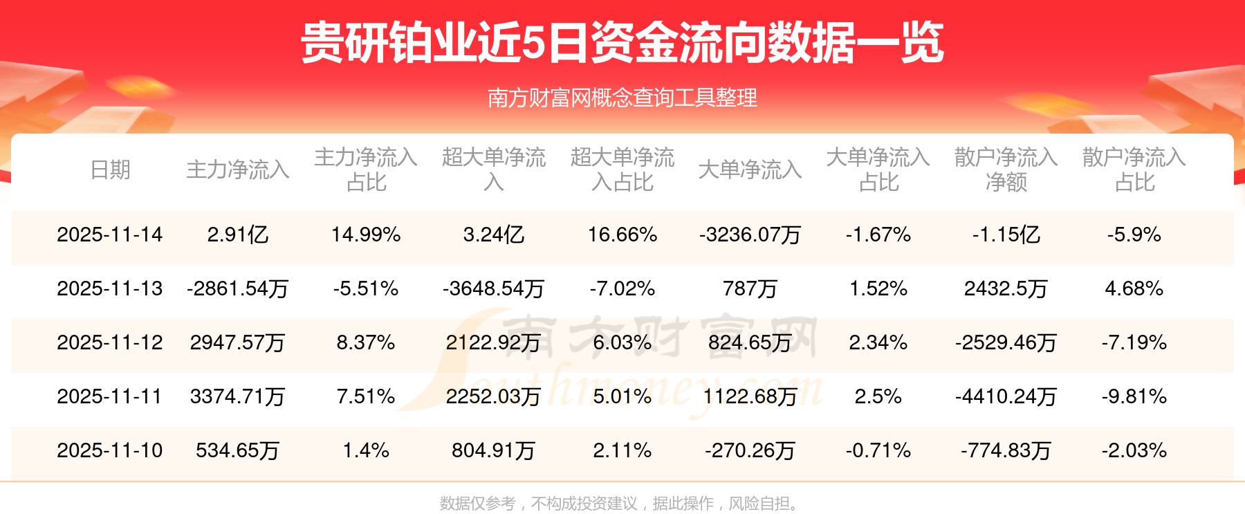 11月14日消息,貴研鉑業(yè)11月14日主力凈流入2.91億元,超大單凈流入3.24億元,大單凈流出3236.07萬元,散戶凈流出1.15億元。