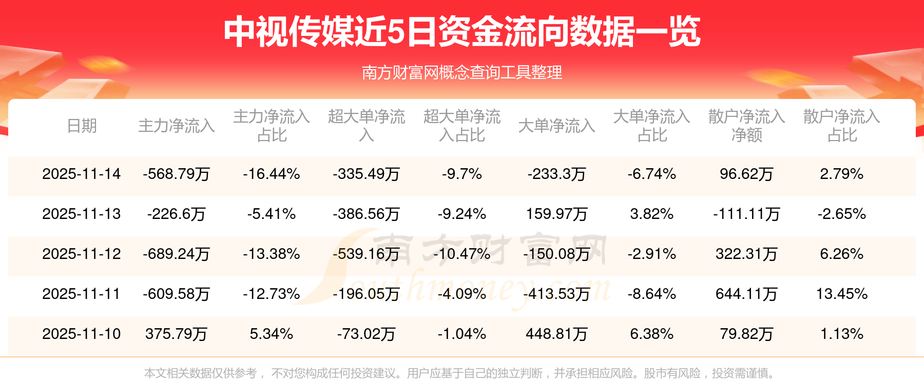 11月14日消息,中視傳媒11月14日主力資金凈流出568.79萬(wàn)元,超大單資金凈流出335.49萬(wàn)元,大單資金凈流出233.3萬(wàn)元,散戶資金凈流入96.62萬(wàn)元。
