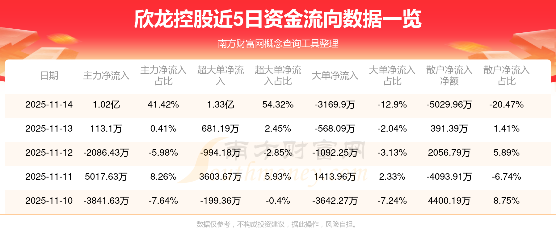 11月14日消息,欣龍控股主力資金凈流入1.02億元,超大單資金凈流入1.33億元,散戶資金凈流出5029.96萬元。