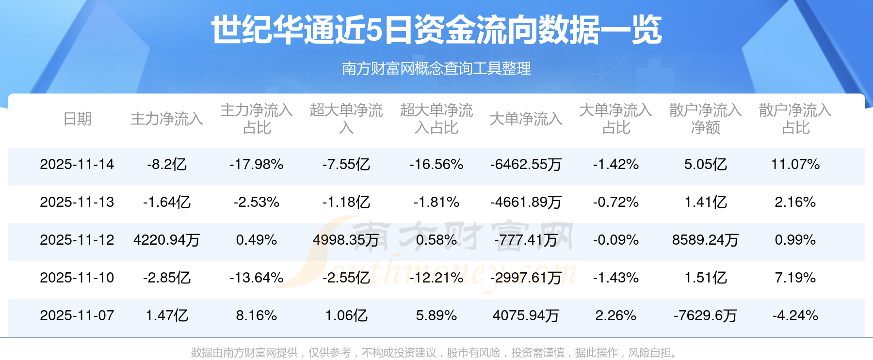 11月14日消息,世紀(jì)華通資金凈流出8.2億元,超大單凈流出7.55億元,換手率3.63%,成交金額45.6億元。