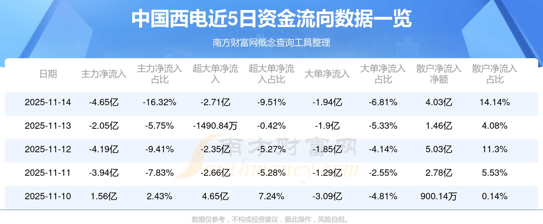 11月14日該股主力凈流出4.65億元,超大單凈流出2.71億元,大單凈流出1.94億元,中單凈流入6203.23萬元,散戶凈流入4.03億元。
