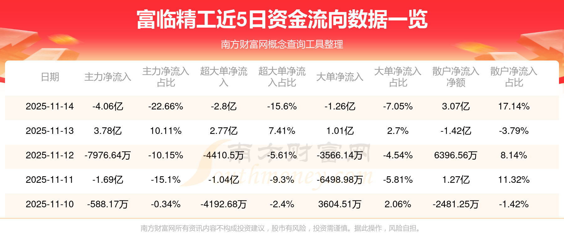 11月14日消息,富臨精工資金凈流出4.06億元,超大單凈流出2.8億元,換手率5.39%,成交金額17.92億元。