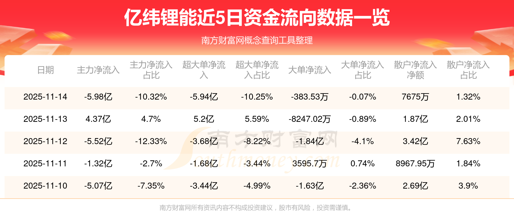 11月14日該股主力凈流出5.98億元,超大單凈流出5.94億元,大單凈流出383.53萬元,中單凈流入5.21億元,散戶凈流入7675萬元。