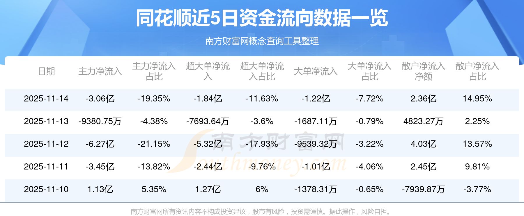 11月14日消息,同花順11月14日主力資金凈流出3.06億元,超大單資金凈流出1.84億元,大單資金凈流出1.22億元,散戶資金凈流入2.36億元。
