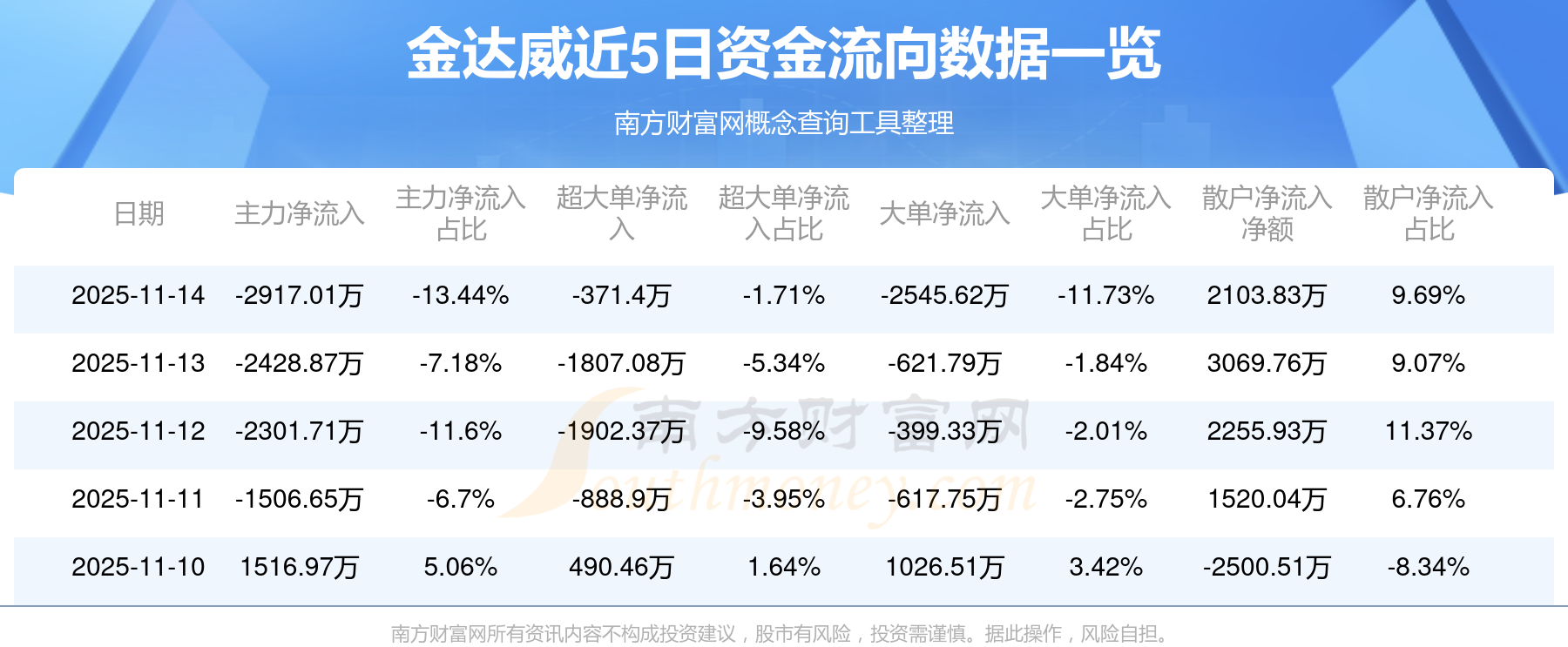 11月14日資金凈流出2917.01萬(wàn)元,超大單凈流出371.4萬(wàn)元,換手率1.7%,成交金額2.17億元。