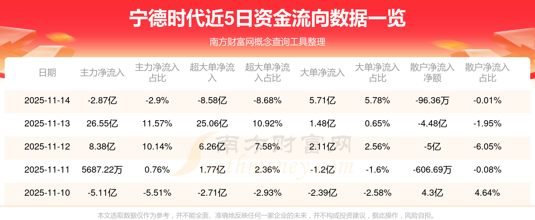 11月14日消息,寧德時代資金凈流出2.87億元,超大單凈流出8.58億元,換手率0.57%,成交金額98.79億元。