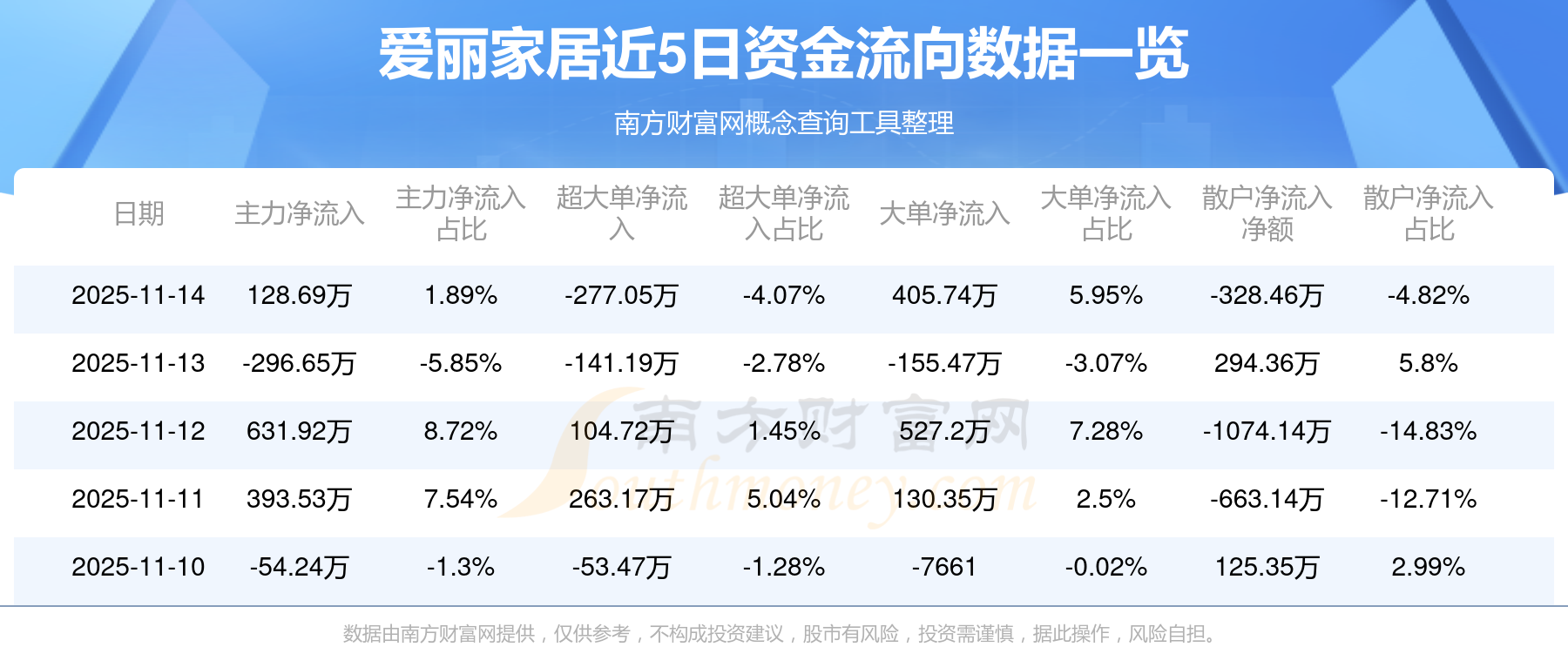 11月14日消息,愛麗家居資金凈流入128.69萬元,超大單凈流出277.05萬元,換手率2.17%,成交金額6813.77萬元。