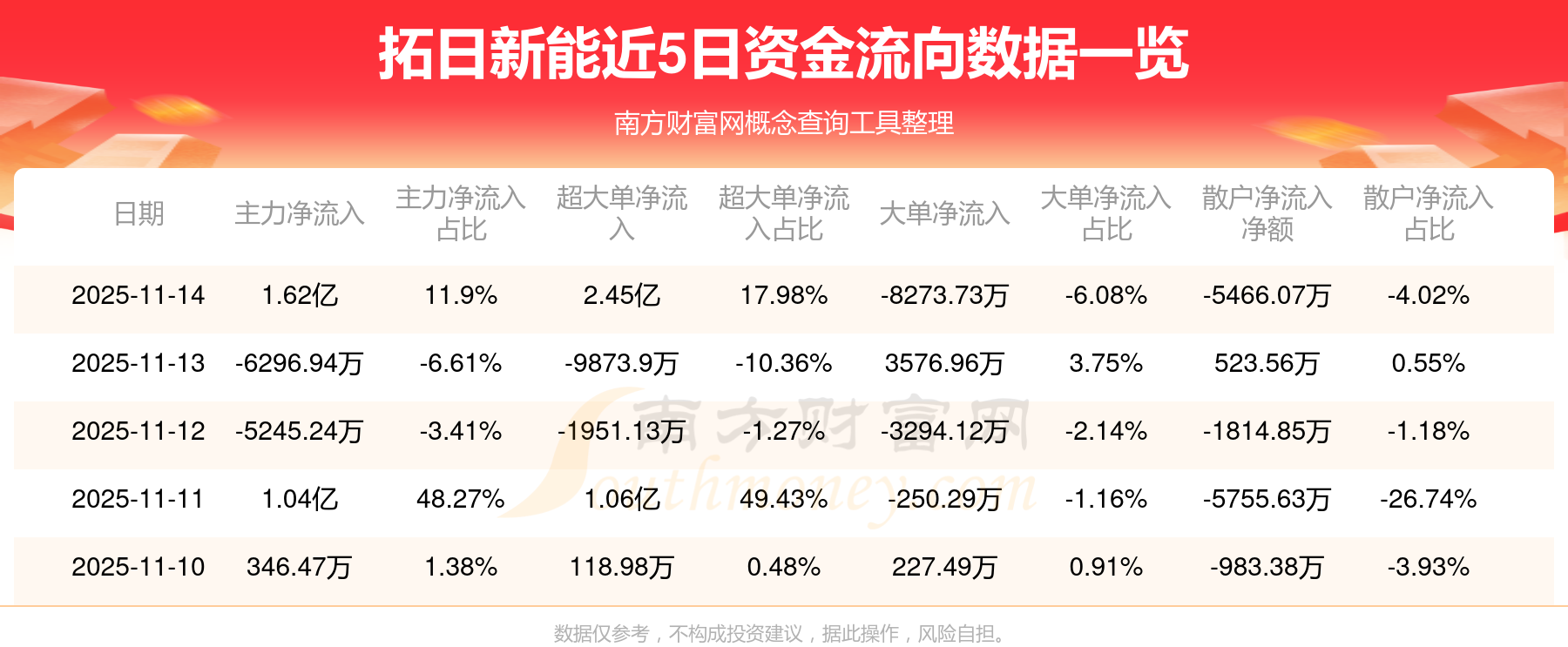 11月14日消息,拓日新能11月14日主力凈流入1.62億元,超大單凈流入2.45億元,大單凈流出8273.73萬元,散戶凈流出5466.07萬元。
