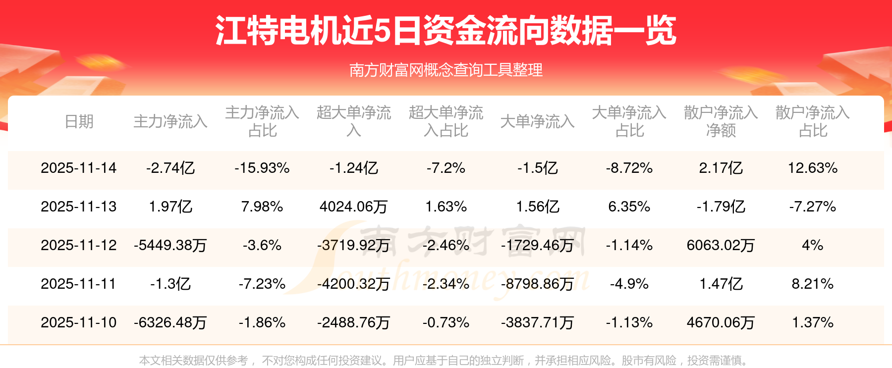 11月14日消息,江特電機資金凈流出2.74億元,超大單凈流出1.24億元,換手率8.56%,成交金額17.18億元。