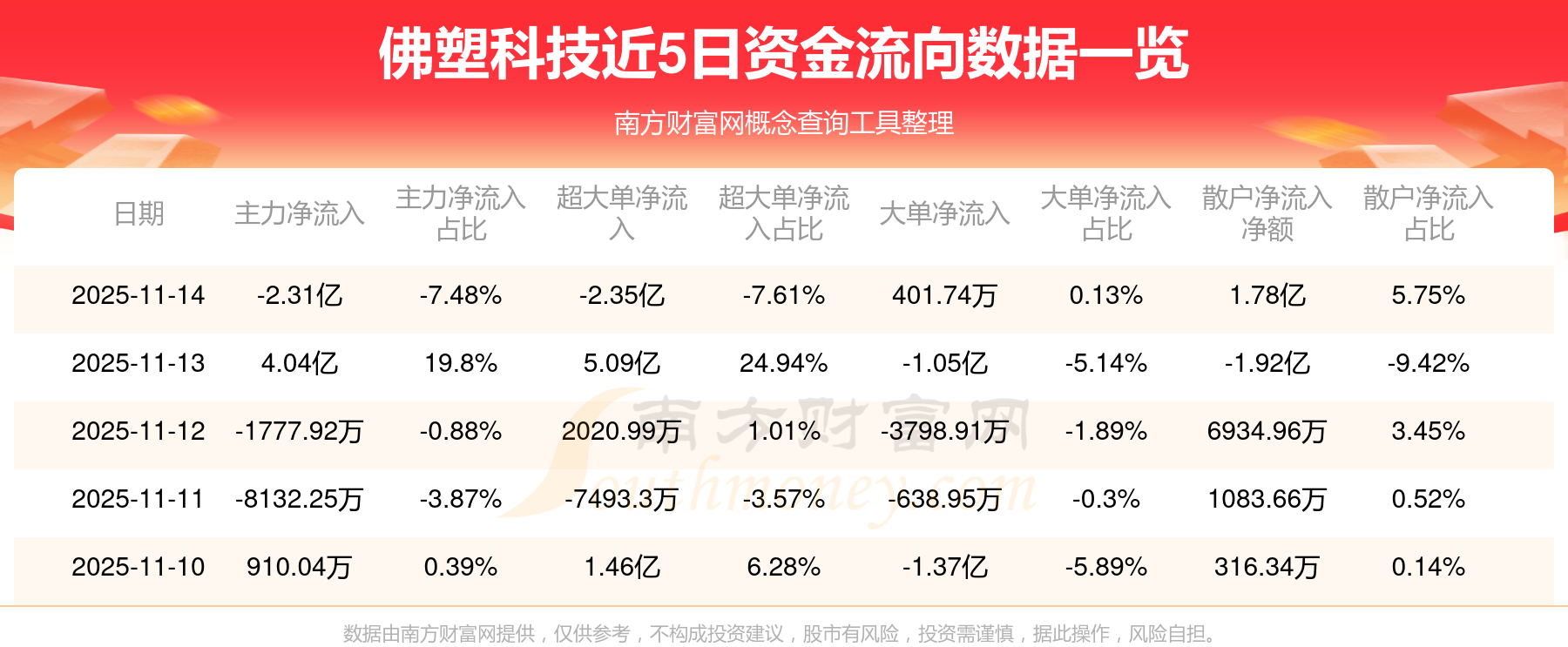11月14日消息,佛塑科技主力資金凈流出2.31億元,超大單資金凈流出2.35億元,散戶資金凈流入1.78億元。