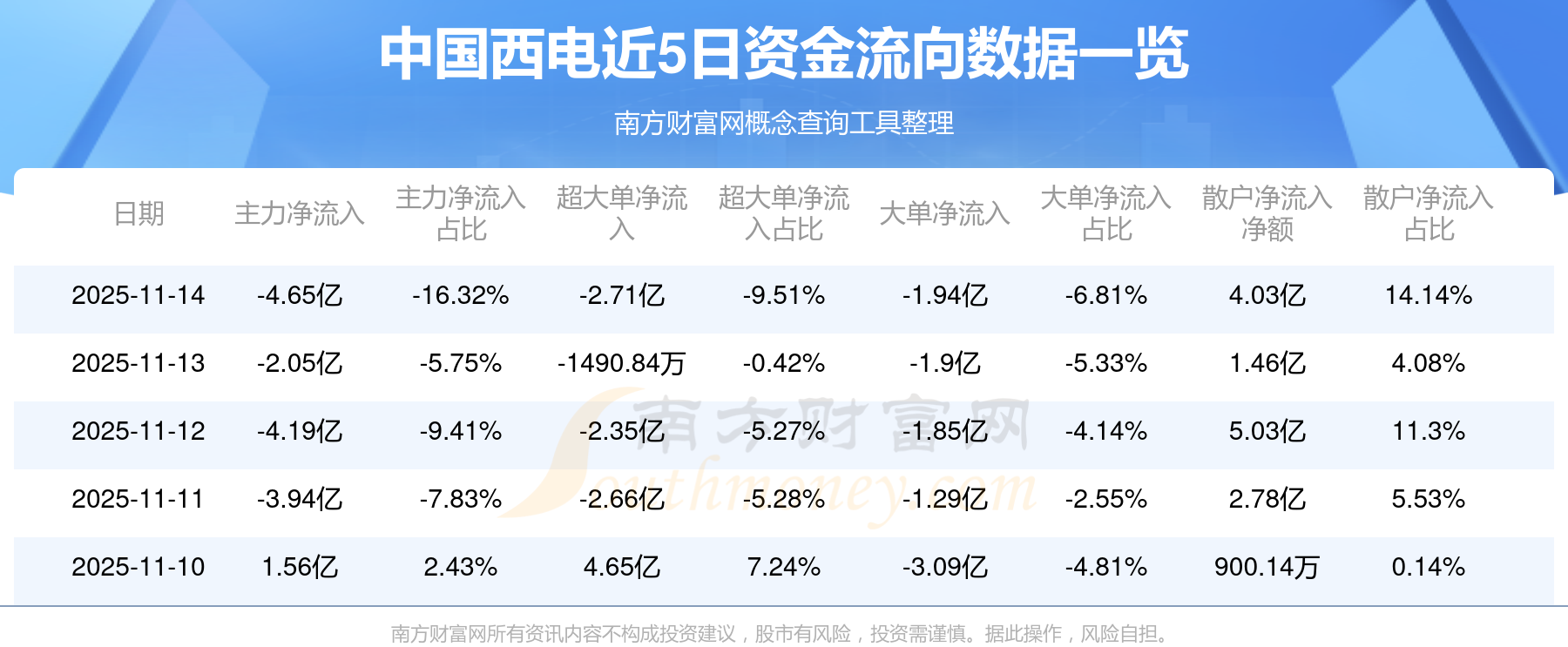 11月14日消息,中國西電資金凈流出4.65億元,超大單凈流出2.71億元,換手率5.89%,成交金額28.52億元。