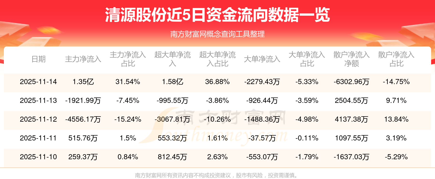 11月14日消息,清源股份資金凈流入1.35億元,超大單資金凈流入1.58億元,換手率10.17%,成交金額4.27億元。