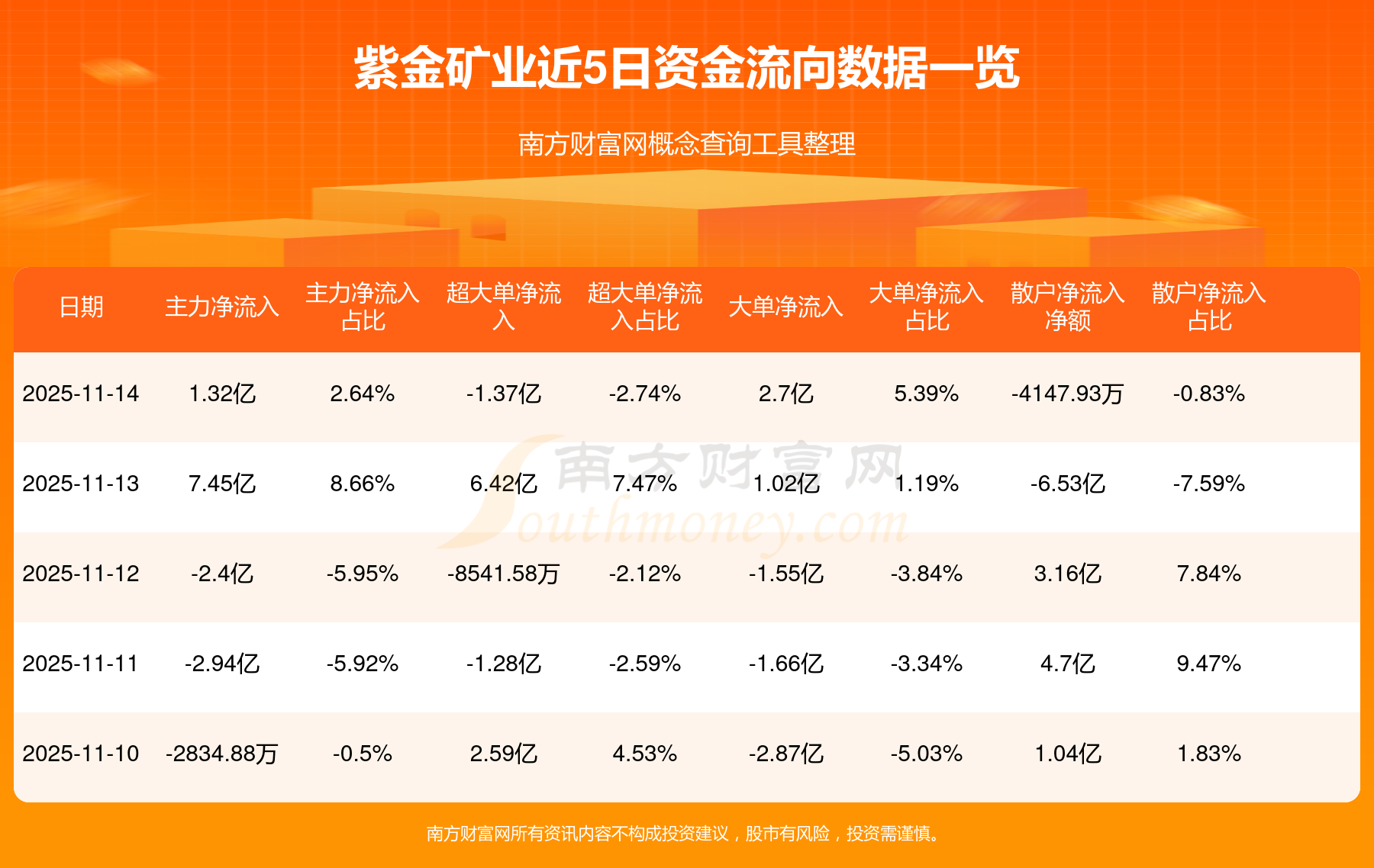 11月14日該股主力資金凈流入1.32億元,超大單資金凈流出1.37億元,大單資金凈流入2.7億元,中單資金凈流出9090.69萬元,散戶資金凈流出4147.93萬元。