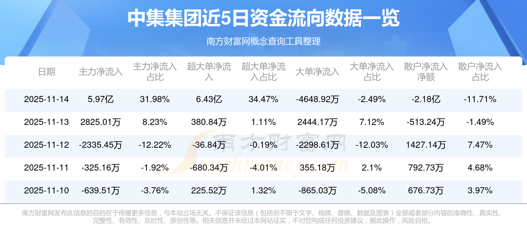 11月14日消息,中集集團(tuán)主力資金凈流入5.97億元,超大單資金凈流入6.43億元,散戶資金凈流出2.18億元。
