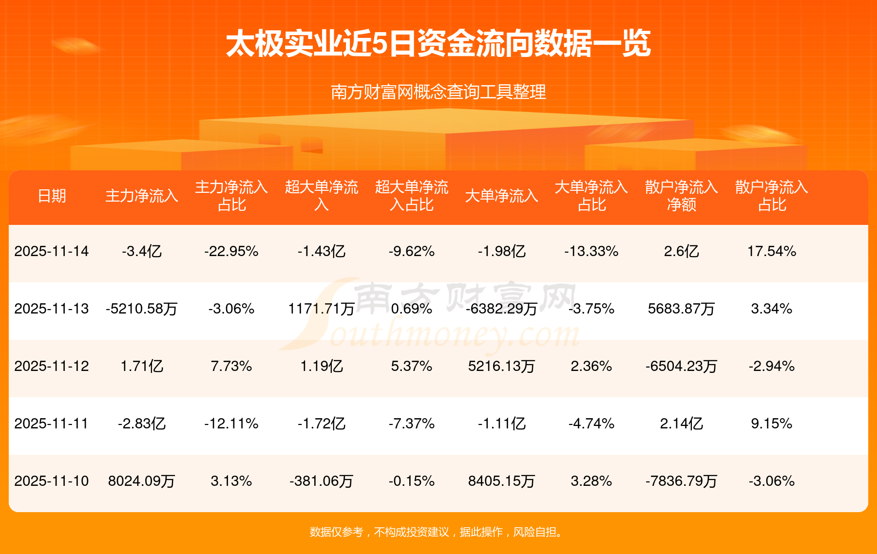 11月14日消息,太極實業(yè)資金凈流出3.4億元,超大單凈流出1.43億元,換手率7.68%,成交金額14.82億元。