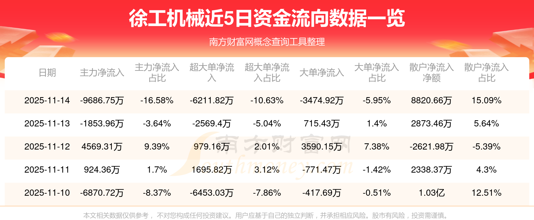 11月14日消息,徐工機(jī)械11月14日主力資金凈流出9686.75萬(wàn)元,超大單資金凈流出6211.82萬(wàn)元,大單資金凈流出3474.92萬(wàn)元,散戶(hù)資金凈流入8820.66萬(wàn)元。