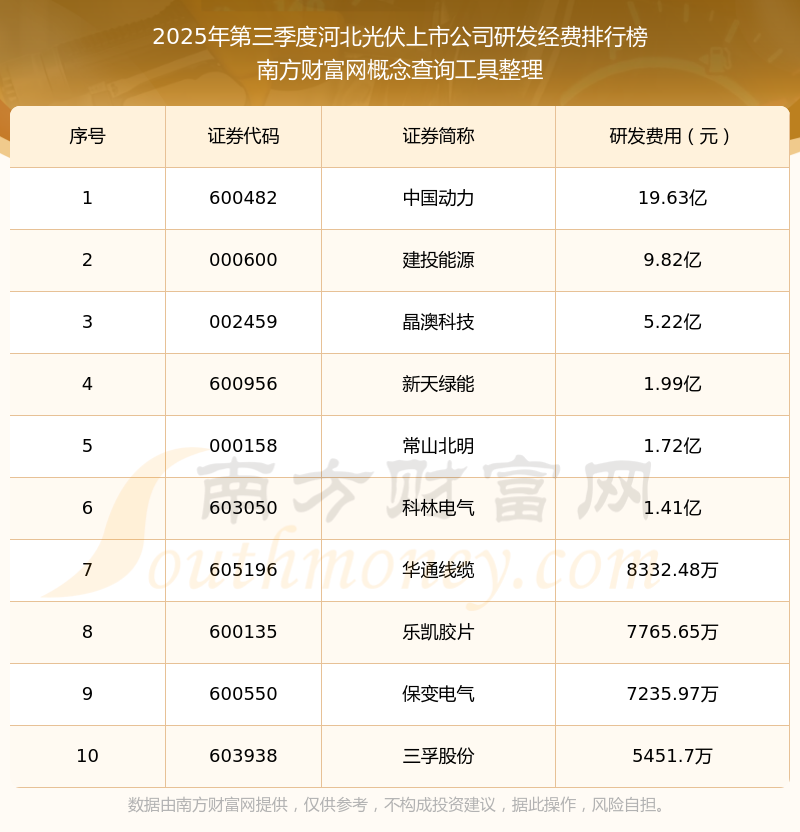 2025年第三季度,河北光伏上市公司研發(fā)經(jīng)費(fèi)排行榜中,中國動力(600482)研發(fā)經(jīng)費(fèi)總額高達(dá)19.63億,建投能源(000600)和晶澳科技(002459)排名第二和第三,新天綠能(600956)、常山北明(000158)、科林電氣(603050)、華通線纜(605196)、樂凱膠片(600135)、保變電氣(600550)、三孚股份(603938)進(jìn)入前十,研發(fā)經(jīng)費(fèi)總額分別排名第4-10名。