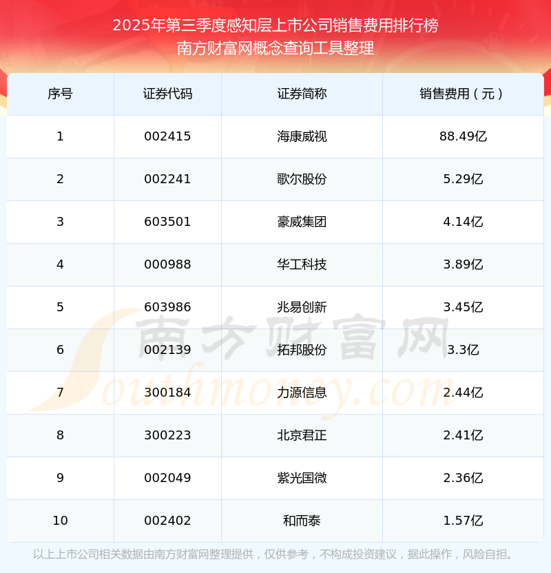 2025年第三季度感知層上市公司銷(xiāo)售費(fèi)用排行榜如下:海康威視(002415)的銷(xiāo)售費(fèi)用總額高達(dá)88.49億,歌爾股份(002241)和豪威集團(tuán)(603501)分別位居第二和第三,華工科技(000988)、兆易創(chuàng)新(603986)、拓邦股份(002139)、力源信息(300184)、北京君正(300223)、紫光國(guó)微(002049)、和而泰(002402)分別進(jìn)入前十,其銷(xiāo)售費(fèi)用總額分別排名第4-10名。