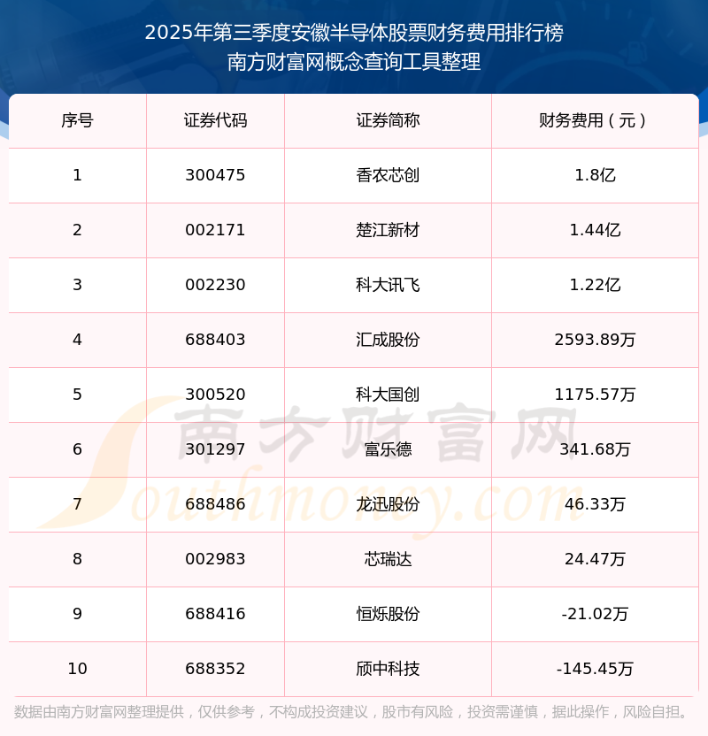 2025年第三季度安徽半導(dǎo)體股票財(cái)務(wù)費(fèi)用排行榜如下:香農(nóng)芯創(chuàng)(300475)的財(cái)務(wù)費(fèi)用總額高達(dá)1.8億,楚江新材(002171)和科大訊飛(002230)分別位居第二和第三,匯成股份(688403)、科大國創(chuàng)(300520)、富樂德(301297)、龍迅股份(688486)、芯瑞達(dá)(002983)、恒爍股份(688416)、頎中科技(688352)分別進(jìn)入前十,其財(cái)務(wù)費(fèi)用總額分別排名第4-10名。