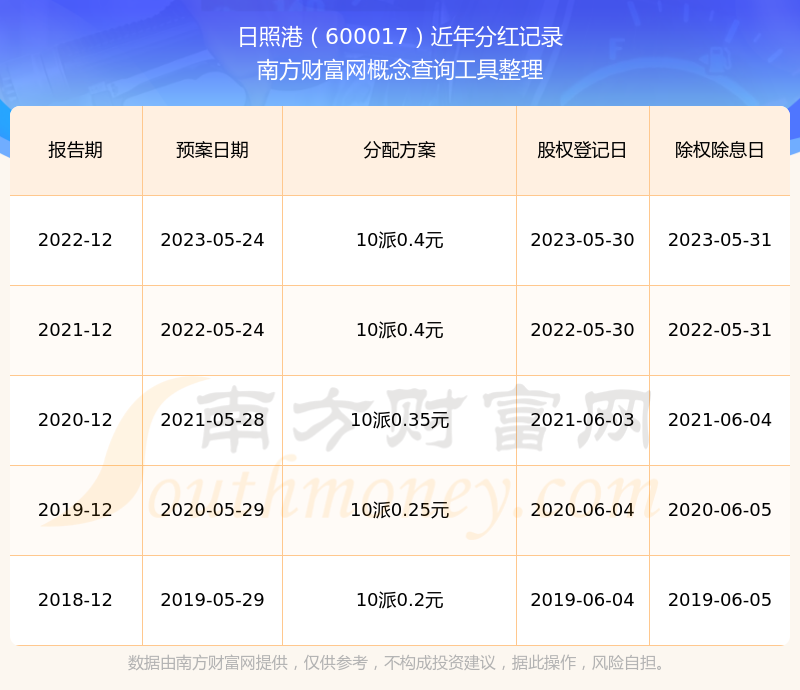日照港最新一次公布的分紅方案為10派0.4元。本次權(quán)益分派股權(quán)登記日為2023年5月30日,除權(quán)除息日為2023年5月31日,派息日為2023年5月31日。