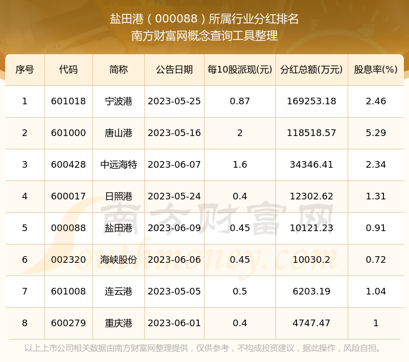 按照南方財富網(wǎng)趨勢選股系統(tǒng)統(tǒng)計,鹽田港所屬行業(yè)為航運港口行業(yè),航運港口行業(yè)分紅排名情況如下表: