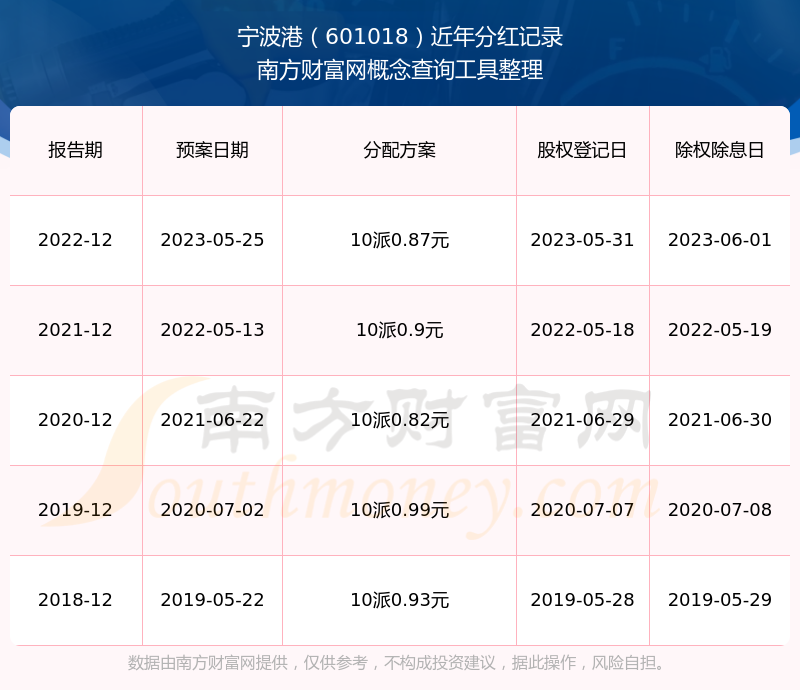 寧波港最新一次公布的分紅方案為10派0.87元。本次權(quán)益分派股權(quán)登記日為2023年5月31日,除權(quán)除息日為2023年6月1日,派息日為2023年6月1日。