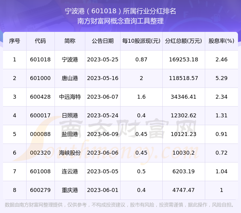 按照南方財(cái)富網(wǎng)趨勢選股系統(tǒng)統(tǒng)計(jì),寧波港所屬行業(yè)為航運(yùn)港口行業(yè),航運(yùn)港口行業(yè)分紅排名情況如下表:
