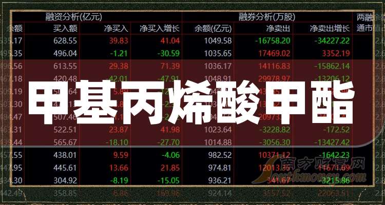 據(jù)南方財富網(wǎng)概念查詢工具數(shù)據(jù)顯示,甲基丙烯酸甲酯受益概念股有: