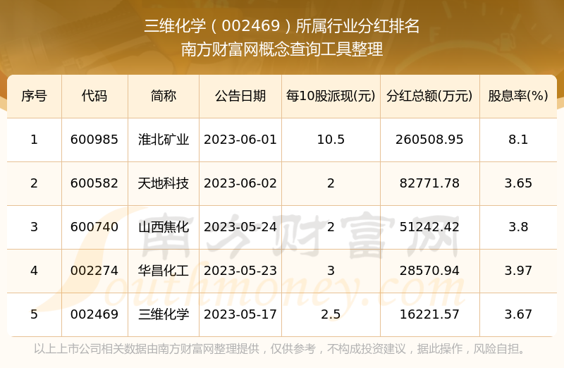 按照南方財(cái)富網(wǎng)趨勢選股系統(tǒng)統(tǒng)計(jì),三維化學(xué)所屬行業(yè)為化學(xué)原料行業(yè),化學(xué)原料行業(yè)分紅排名情況如下表:
