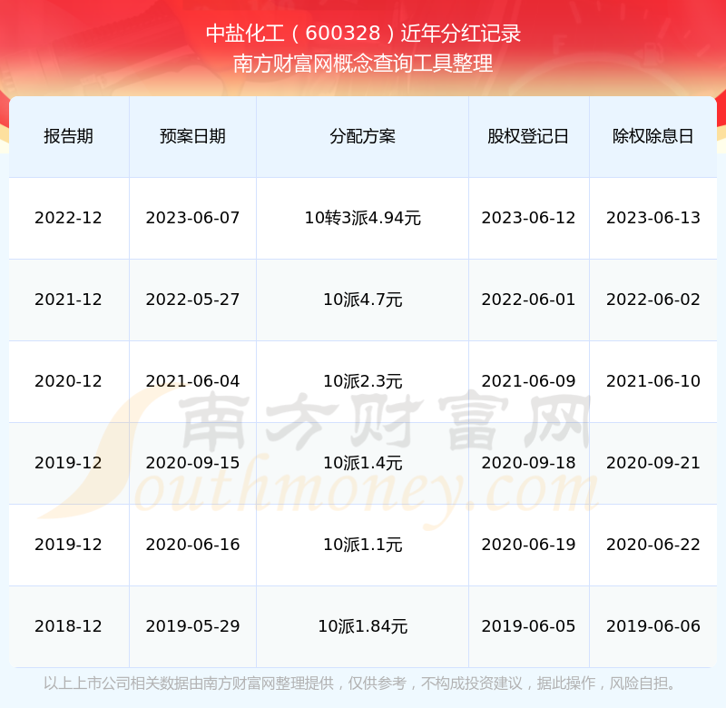 中鹽化工最新一次公布的分紅方案:10轉(zhuǎn)3派4.94元。