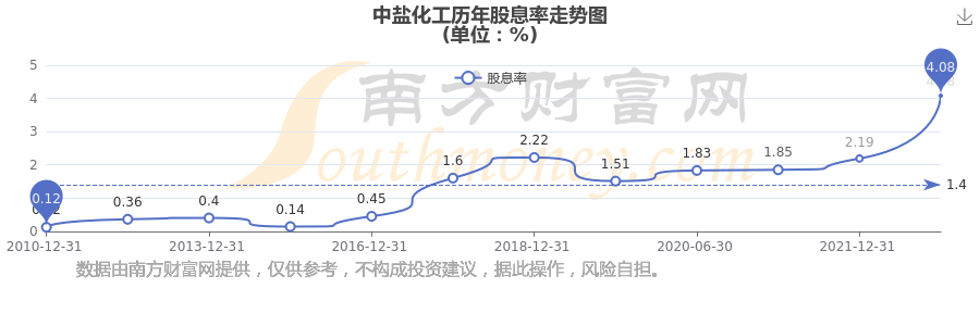 按照南方財富網(wǎng)趨勢選股系統(tǒng)統(tǒng)計,中鹽化工所屬行業(yè)為鹽化工行業(yè),鹽化工行業(yè)分紅排名情況如下表: