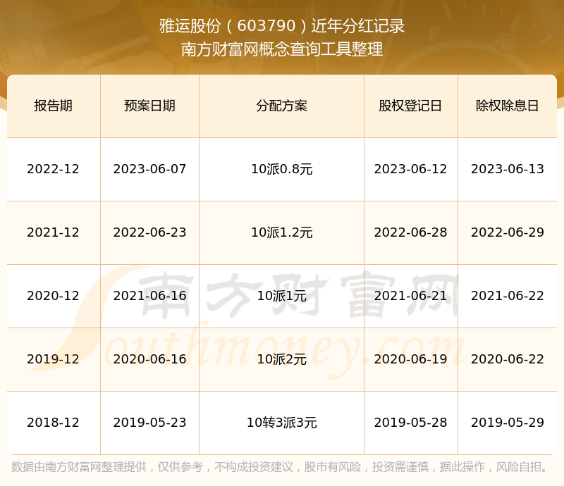 雅運股份最新一次公布的分紅方案為10派0.8元。本次權(quán)益分派股權(quán)登記日為2023年6月12日,除權(quán)除息日為2023年6月13日,派息日為2023年6月13日。