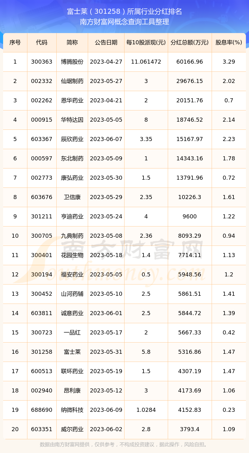 按照南方財(cái)富網(wǎng)趨勢選股系統(tǒng)統(tǒng)計(jì),富士萊所屬行業(yè)為化學(xué)制藥行業(yè),化學(xué)制藥行業(yè)分紅排名情況如下表: