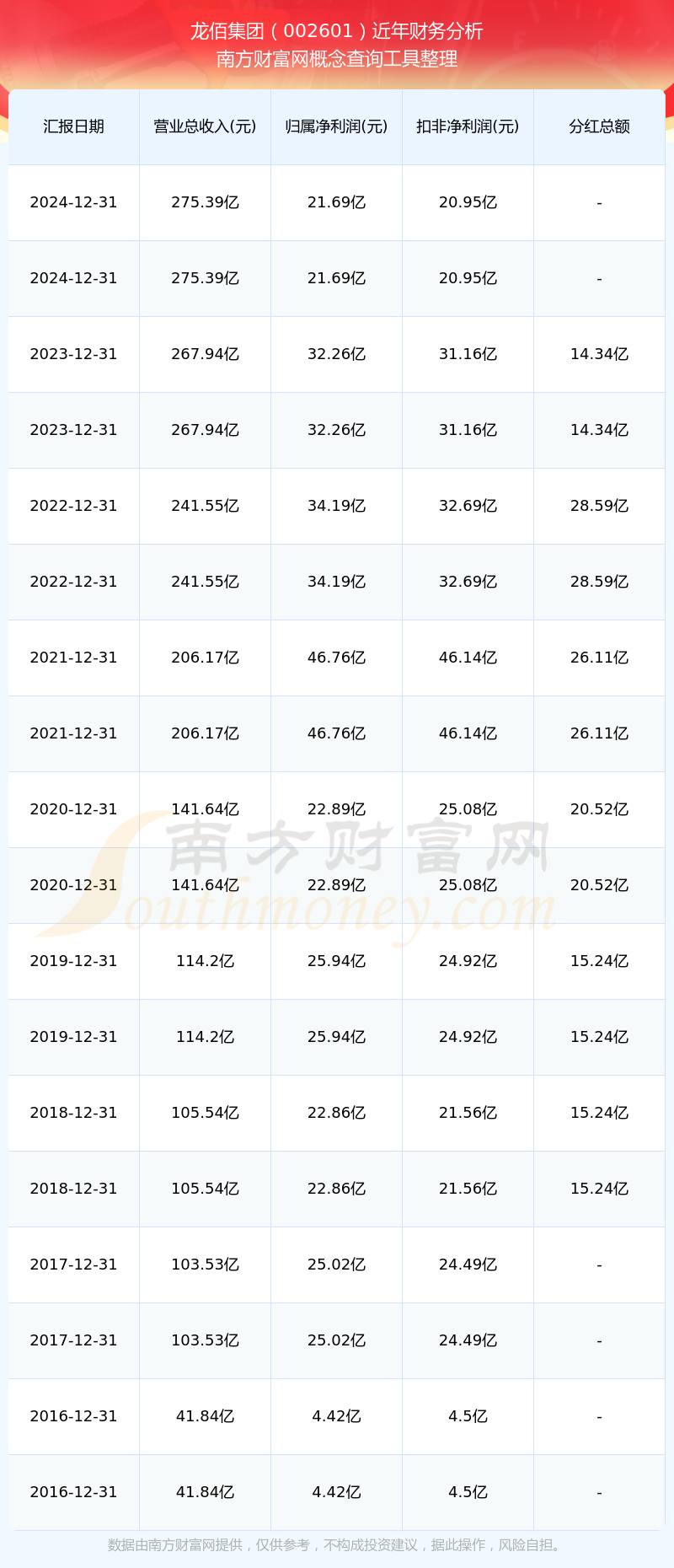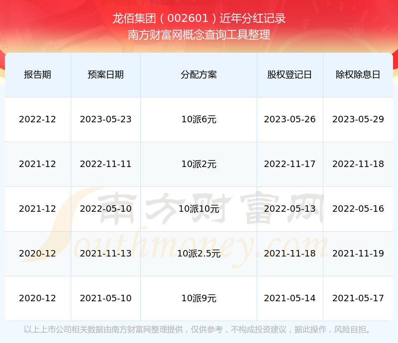龍佰集團最新一次公布的分紅方案為10派6元。本次權(quán)益分派股權(quán)登記日為2023年5月26日,除權(quán)除息日為2023年5月29日,派息日為2023年5月29日。