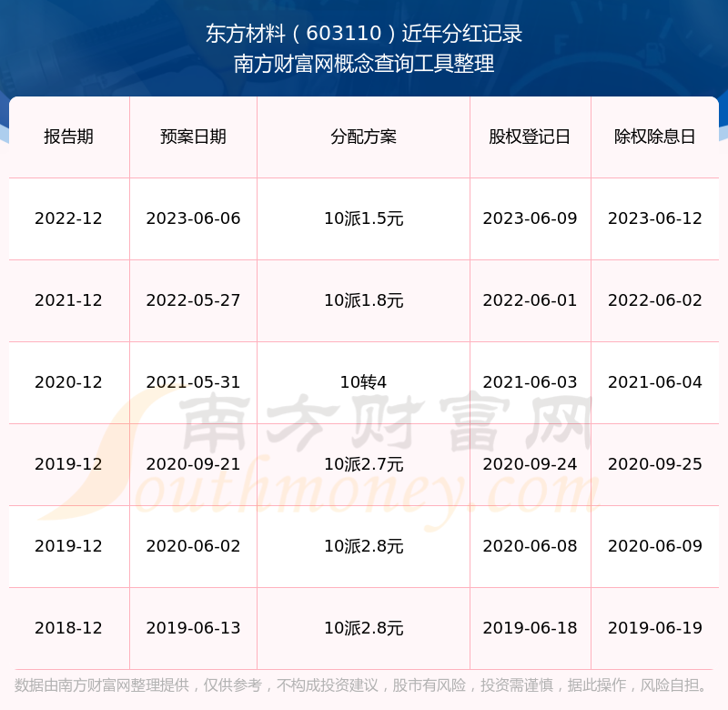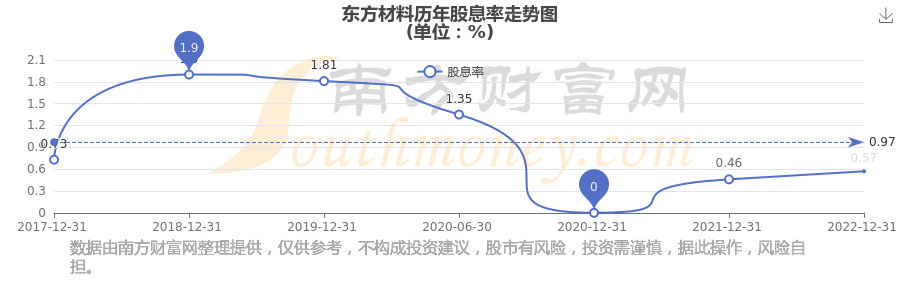 東方材料最新一次公布的分紅方案為10派1.5元。本次權(quán)益分派股權(quán)登記日為2023年6月9日,除權(quán)除息日為2023年6月12日,派息日為2023年6月12日。