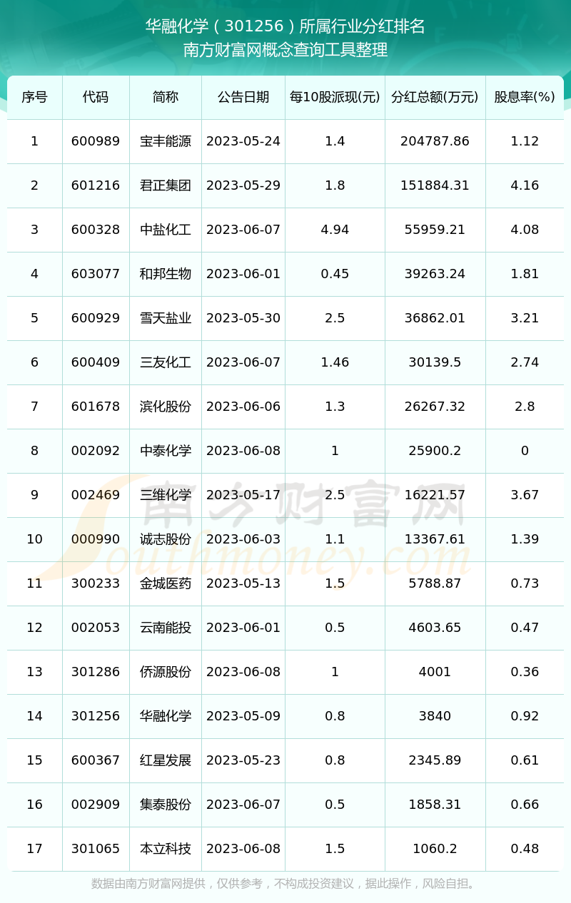按照南方財富網(wǎng)趨勢選股系統(tǒng)統(tǒng)計,華融化學(xué)所屬行業(yè)為化學(xué)原料行業(yè),化學(xué)原料行業(yè)分紅排名情況如下表: