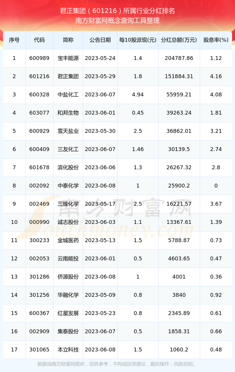 按照南方財富網(wǎng)趨勢選股系統(tǒng)統(tǒng)計,君正集團所屬行業(yè)為化學原料行業(yè),化學原料行業(yè)分紅排名情況如下表: