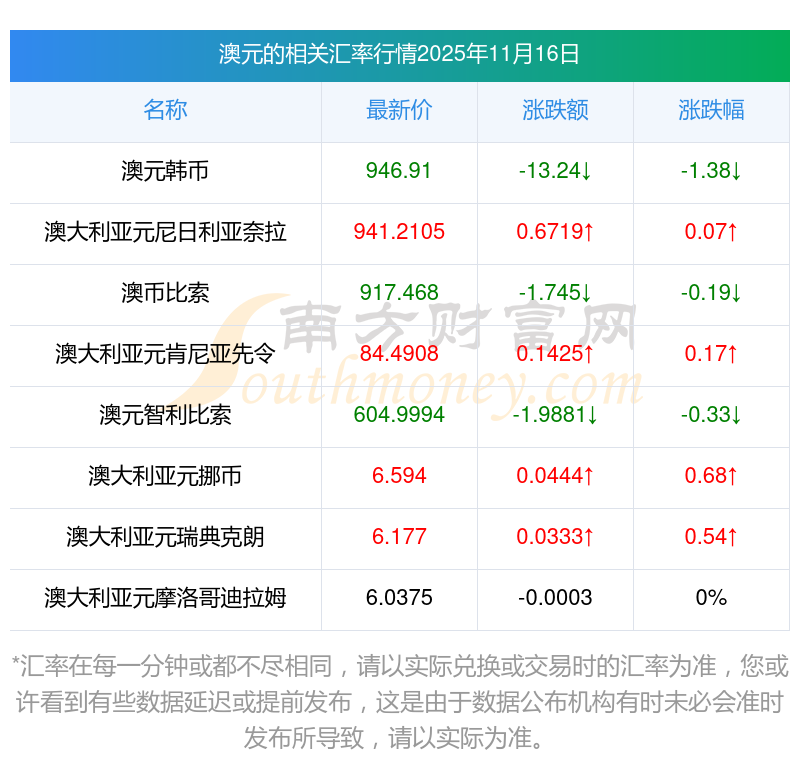 2025年11月16日最新消息,澳元兌換韓幣最新匯率為946.910000,今開為960.0700,昨收為946.9100,最高為962.2100,最低為944.6700。