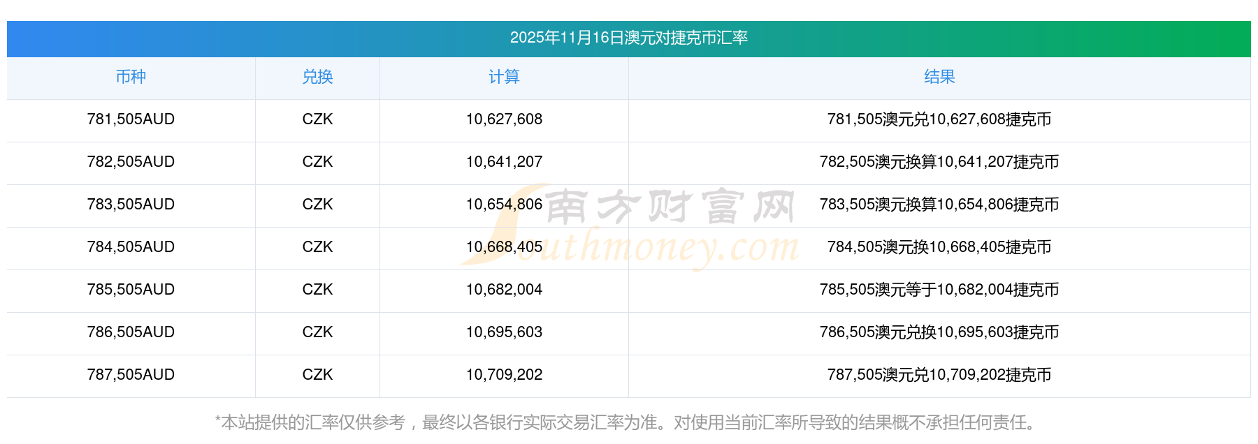 2025年11月16日,貨幣兌換:1澳元=13.5989捷克幣。舉例:假如一瓶礦泉水需要1澳元,則需捷克幣:13.5989捷克幣。